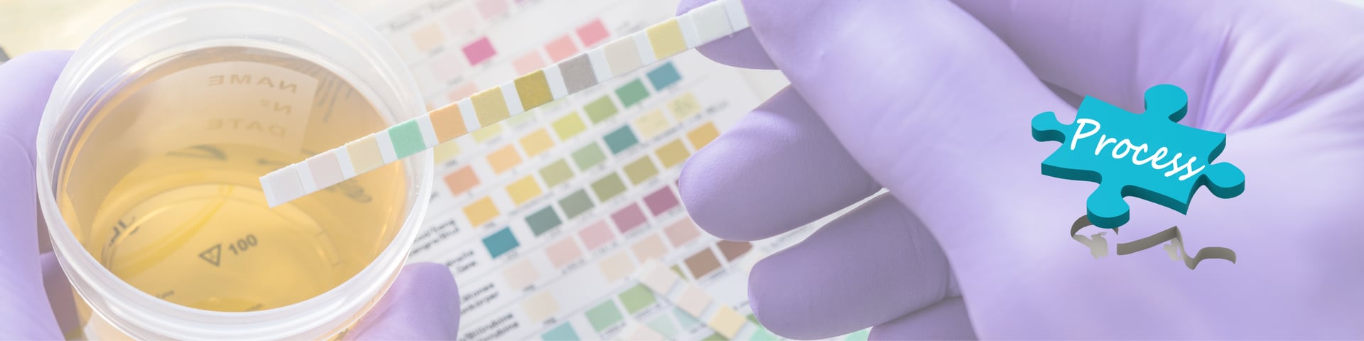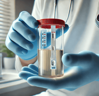 In a urine test, a urine sample is collected in a sterile container. This is either analyzed directly on site with a test strip or sent to the laboratory to obtain more accurate results.